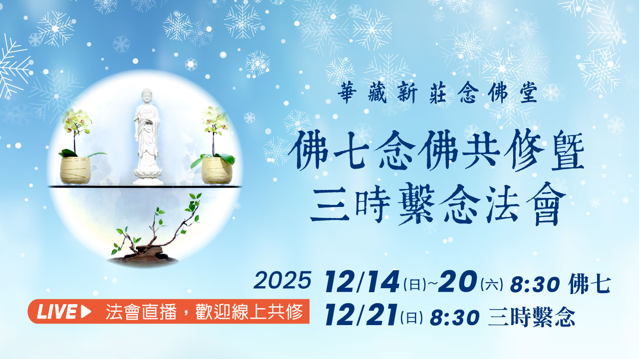 12月14~20日佛七念佛共修,實習主七 莊明法師;21日三時繫念法會,實習主法 莊傳法師,佛七及法會網路直播。歡迎網路線上同步共修。相關資訊請參閱…
