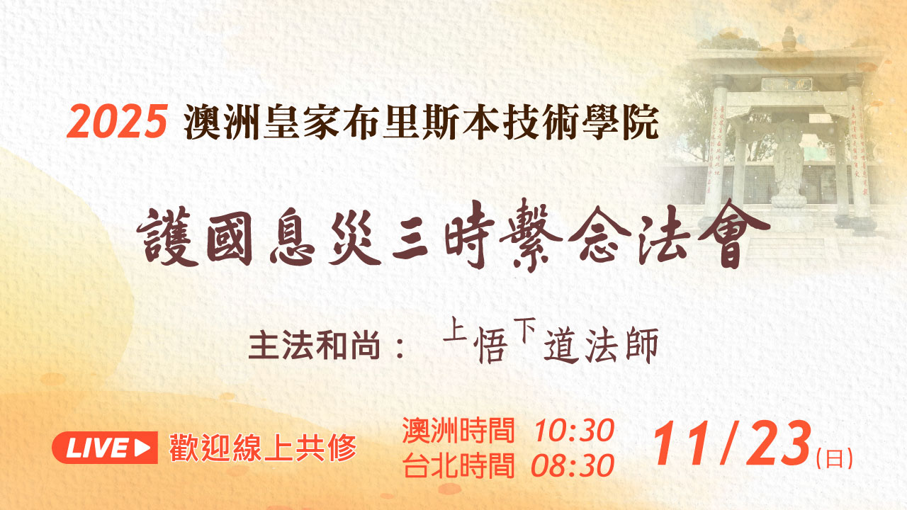 11月9~15日佛七念佛共修,實習主七 莊明法師;16日三時繫念法會,實習主法 莊霖法師,佛七及法會網路直播。歡迎網路線上同步共修。相關資訊請參閱…