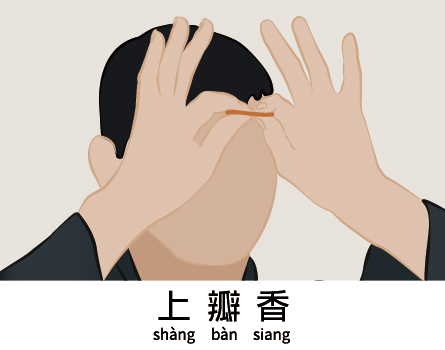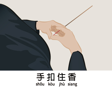 上香時,用雙手的食指及中指夾住香(左手在前、右手在後),並用大拇指將香腳扣住,執時當胸、舉時齊眉,上身保持不動,香插好後,再一問訊。