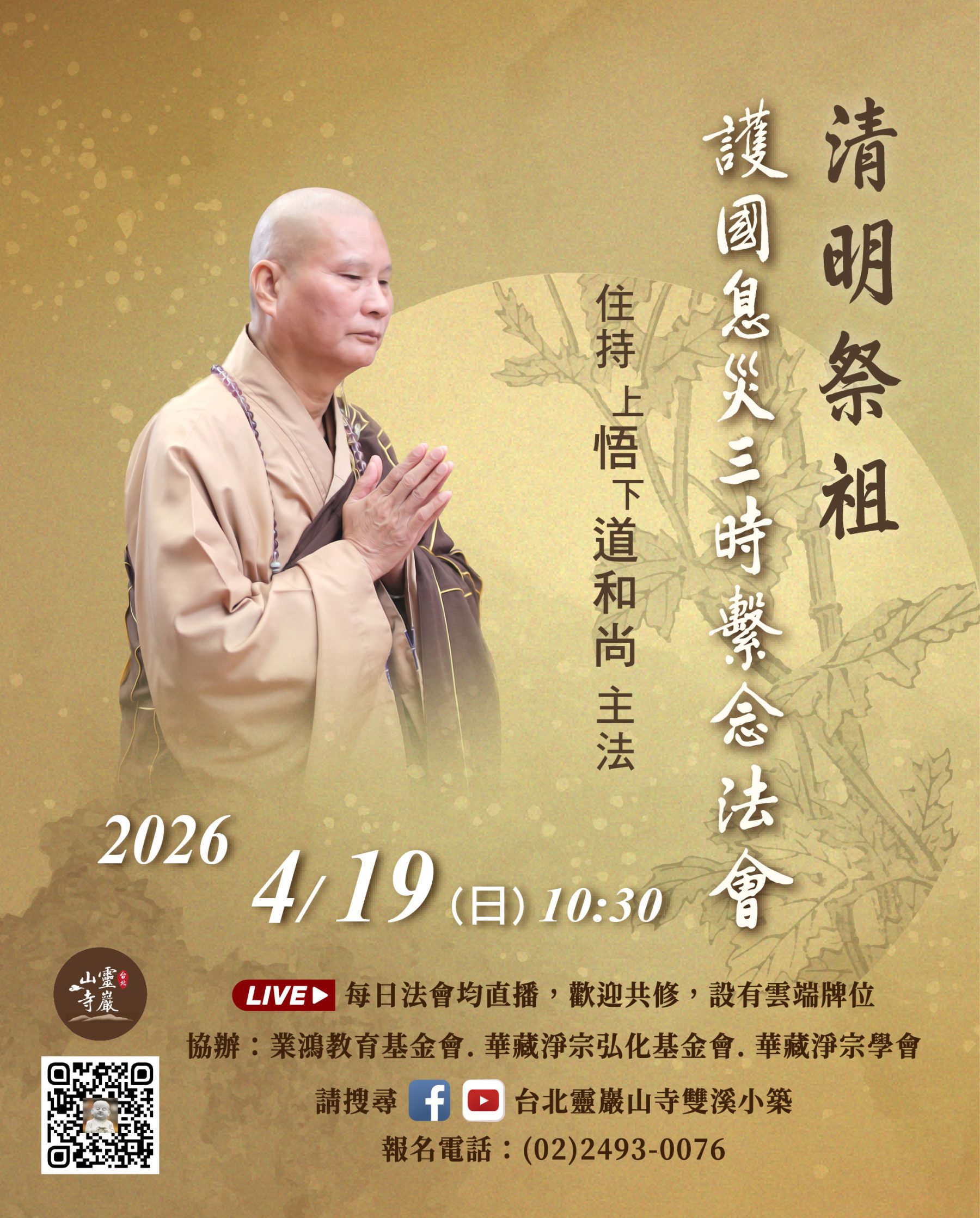首頁 > 最新消息 > 法會講經 > 法會 > 4/19 線上直播共修|雙溪小築清明祭祖護國息災三時繫念法會