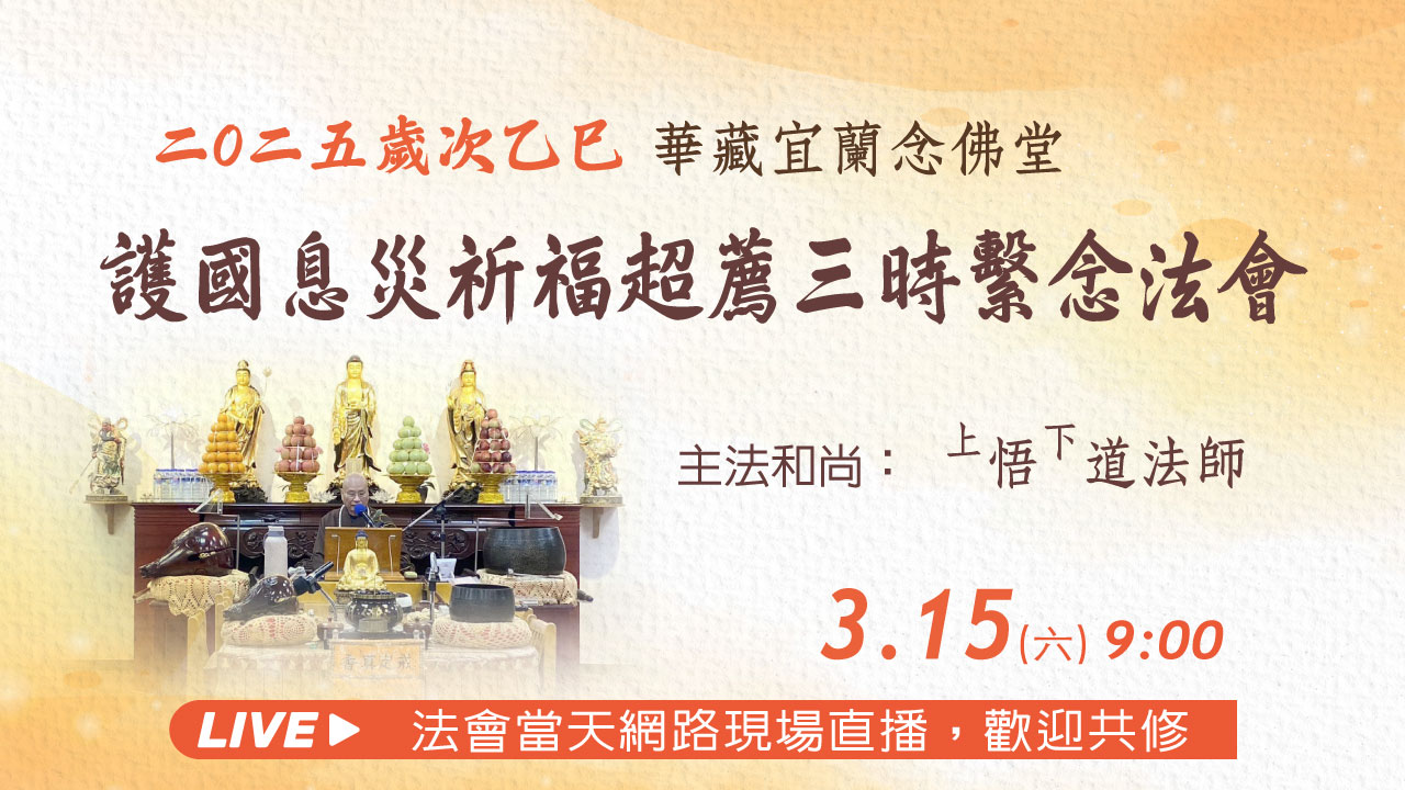 3月15日華藏宜蘭念佛堂啟建乙巳年護國息災祈福超薦三時繫念法會,恭請悟道法師主法,法會當天網路直播,歡迎大家線上共修。